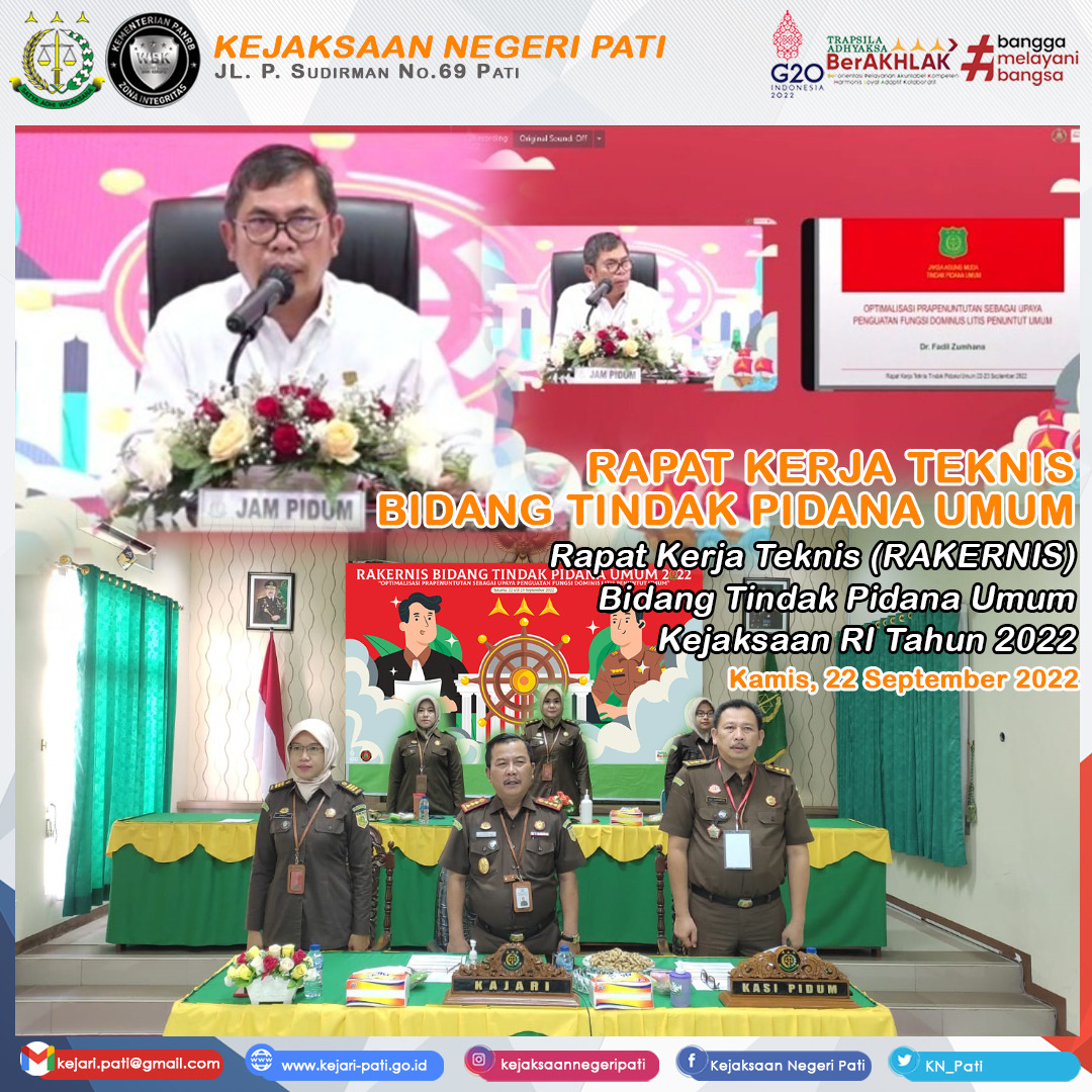 Menindaklanjuti Rapat Kerja Teknis yang sudah dibuka secara resmi oleh Jaksa Agung RI maka pada hari Kamis tanggal 22 September 2022 Jaksa Agung Muda Bidang Tindak Pidana Umum menyelenggarakan Rapat Kerja Teknis Bidang Pidum yang diikuti oleh Kepala Kejaksaan Negeri Pati Bpk Mahmudi, S.H., M.H. beserta jajaran Pidum Pati serta Jajaran Pidum seluruh Indonesia.