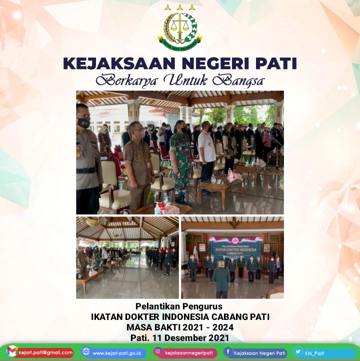 Pada hari ini Sabtu, 11 Desember 2021 Kepala Kejaksaan Negeri Pati (Bapak Mahmudi, S.H., M.H.) mengikuti Pelantikan Pengurus Ikatan Dokter Indonesia Cabang Pati di Pendopo Kabupaten Pati.