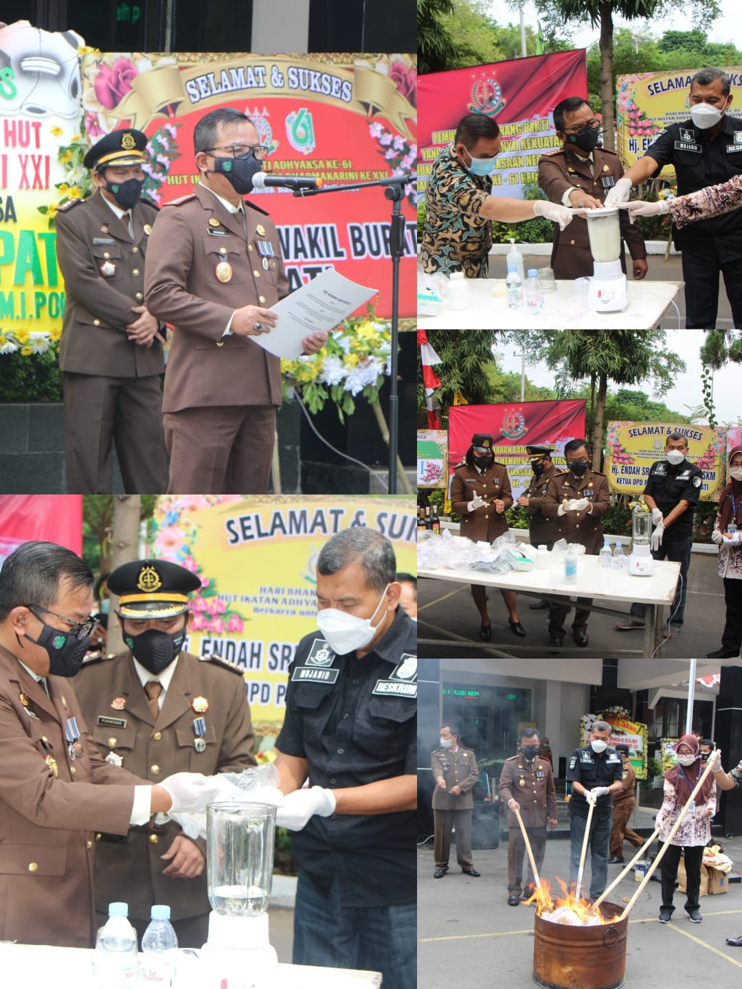 Pada hari Kamis tanggal 22 Juli 2021 pukul 09.30 wib dalam rangka Peringatan Hari Bhakti Adhyaksa ke-61 oleh Kejaksanaan Negeri Pati melakukan pemusnahan Barang Bukti dan Rampasan dari berbagai jenis perkara tindak pidana. Pemusnahan BB (Barang Bukti) tersebut berasal dari perkara pidana umum yaitu; miras sebanyak 11 perkara (462 botol dan 1 jerigen), perjudian sebanyak 12 perkara, tambang sebanyak 1 perkara, cabul sebanyak 1 perkara serta narkotika dan kesehatan sebanyak 11 perkara (2.520 butir/tablet dan 505,57 gram) yang telah mempunyai Kekuatan Hukum tetap bertempat di Halaman Kantor Kejaksaan Negeri Pati.