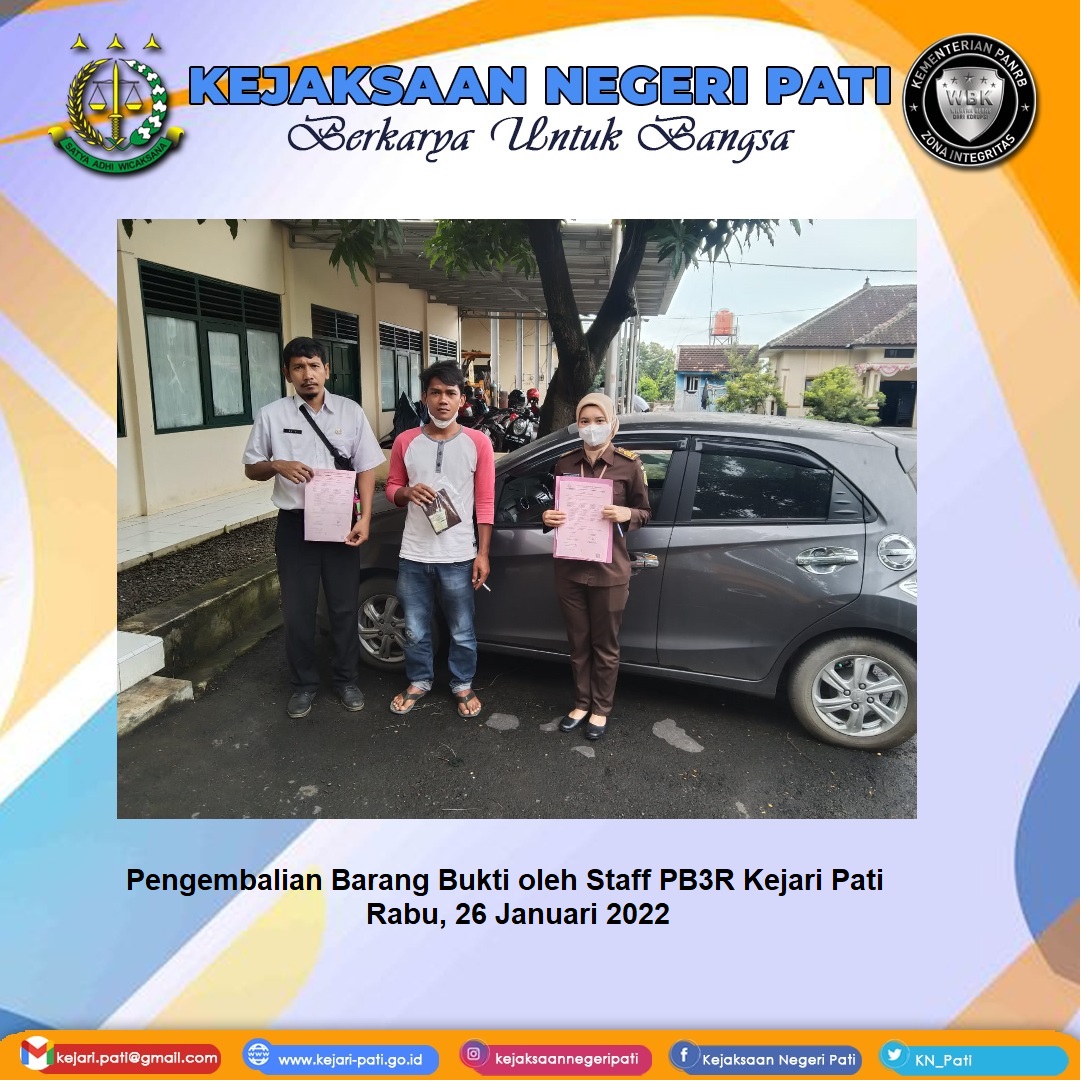 Rabu, 26 Januari 2022 - Kegiatan pengembalian barang bukti perkara pencurian yang telah inkracht kepada saksi korban di Workshop PU oleh staff PB3R Kejari Pati dan disaksikan juga oleh Staff PU Pukul 10.10 WIB.