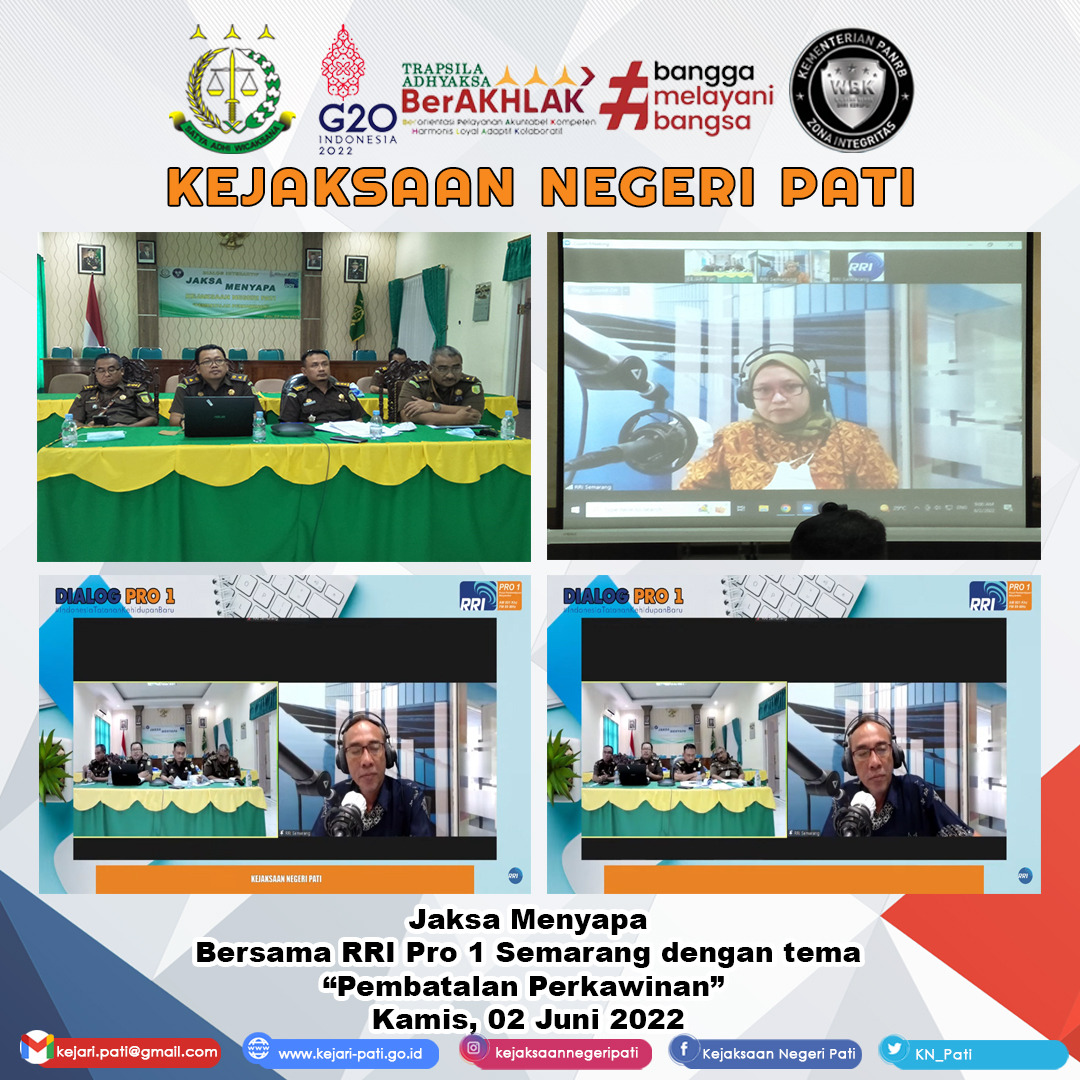 Kejaksaan RI melalui Jaksa Pengacara Negara mempunyai kewenangan untuk melakukan pembatalan pernikahan, sepanjang pernikahan tersebut tidak memenuhi syarat sah perkawinan. Hal ini disampaikan didalam Program Jaksa Menyapa bersama RRI Semarang dengan nara sumber Kasi Intelijen Bpk Teguh Dwi Cahyono SH.,MH., Kasi Datun Bpk Buyung Anjar Purnomo, S.H. pada hari Kamis tanggal 02 Juni 2022 Diharapkan dengan media saluran RRI masyarakat khususnya warga Pati lebih mengenal lembaga Kejaksaan terutama tugas dan kewenangannya.