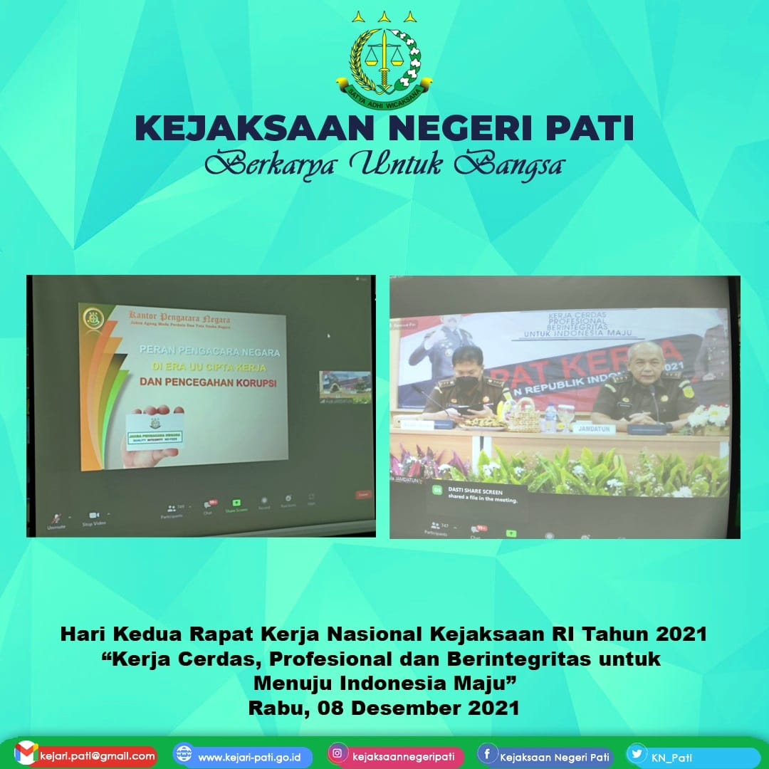 PPATI – Pada hari Rabu, 8 Oktober 2021 Kepala Kejaksaan Negeri Pati (Bapak Mahmudi, S.H., M.H.) bersama Kepala Seksi Intelijen (Bapak Teguh Dwicahyono, S.H., M.H.), Kepala Seksi Tindak Pidana Umum (Bapak Aji Susanto, S.H., M.H.), Kepala Sub Bagian Pembinaan (Bapak Arie Purnomo, S.H., M.H.), Kepala Seksi Tindak Pidana Khusus (Bapak Herry Setiawan, S.H., M.H.), Kepala Seksi Perdata dan Tata Usaha Negara (Bapak Andri Winanto, S.H., M.H.), dan Kepala Seksi Pengelolaan Barang Bukti dan Barang Rampasan (Bapak Agus Sudarmanto, S.H., M.H.) mengikuti Rapat Kerja Nasional (Rakernas) Kejaksaan RI Tahun 2021. Salah satu pembahasan dalam Rapat Kerja Nasional (Rakernas) yaitu Peran Pengacara Negara di Era UU Cipta dan Pencegahan Korupsi. Rapat Kerja Nasional (Rakernas) Kejaksaan RI Tahun 2021 dilaksanakan melalui video conference.