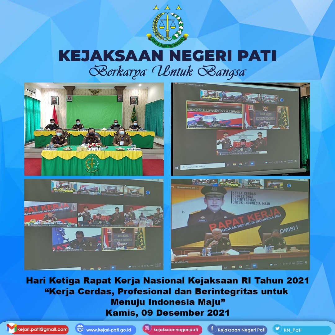 Pada hari ini Kamis, 09 Desember 2021 Kepala Kejaksaan Negeri Pati (Bapak Mahmudi, S.H., M.H.) bersama Kepala Seksi Intelijen (Bapak Teguh Dwicahyono, S.H., M.H.), Kepala Seksi Tindak Pidana Umum (Bapak Aji Susanto, S.H., M.H.), Kepala Sub Bagian Pembinaan (Bapak Arie Purnomo, S.H., M.H.), Kepala Seksi Tindak Pidana Khusus (Bapak Herry Setiawan, S.H., M.H.), Kepala Seksi Perdata dan Tata Usaha Negara (Bapak Andri Winanto, S.H., M.H.), dan Kepala Seksi Pengelolaan Barang Bukti dan Barang Rampasan (Bapak Agus Sudarmanto, S.H., M.H.) mengikuti Rapat Kerja Nasional (Rakernas) Kejaksaan RI Tahun 2021. Dengan mengusung tema “Kerja Cerdas, Profesional dan Berintegritas untuk Menuju Indonesia Maju”.