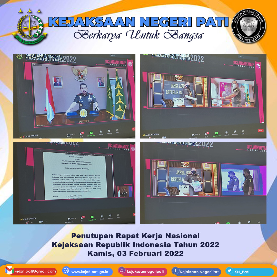 Pada hari ini Kamis, 03 Februari 2022 Kepala Kejaksaan Negeri Pati (Bapak Mahmudi, S.H., M.H.) bersama Para Pejabat Eselon IV mengikuti Rakernas Kewaskitaan Adhyaksa Menuju Indonesia Emas 2045 hari Kedua dan Penutupan Rakernas Tahun 2022.