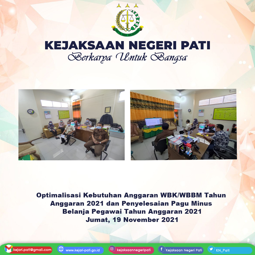 Pada hari ini, Jumat 19 November 2021 Kepala Sub Bagian Pembinaan (Bapak Arie Purnomo, S.H., M.H.), Tim Keuangan (Ibu Wanida Rosadika, Ibu Nur Janah, Bapak Agil Adi Sucipto, dan Bapak Widodo Eko Pramono) mengikuti video conference Optimalisasi Kebutuhan Anggaran WBK/WBBM TA 2021 dan Penyelesaian Pagu Minus Belanja Pegawai TA 2021. Kegiatan dimulai pada pukul 08.30 - 11.00 WIB.