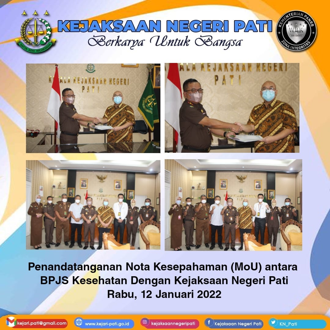 PATI – Pada Hari Rabu, 12 Januari 2022, Kepala Kejaksaan Negeri Pati melaksanakan penandatanganan Nota Kesepahaman atau MoU dengan Kepala Cabang BPJS Kesehatan Cabang Pati tentang Penanganan Masalah Hukum Bidang Perdata dan Tata Usaha Negara dalam Kepesertaan Program JKN-KIS. Kesepakatan Bersama ini dimaksudkan untuk mengoptimalkan pelaksanaan tugas dan fungsi PARA PIHAK dalam penyelesaian masalah hukum bidang Perdata dan Tata Usaha Negara. Tujuan perjanjian kerjasama ini adalah untuk meningkatkan efektifitas penanganan masalah hukum bidang Perdata dan Tata Usaha Negara baik didalam maupun diluar pengadilan.