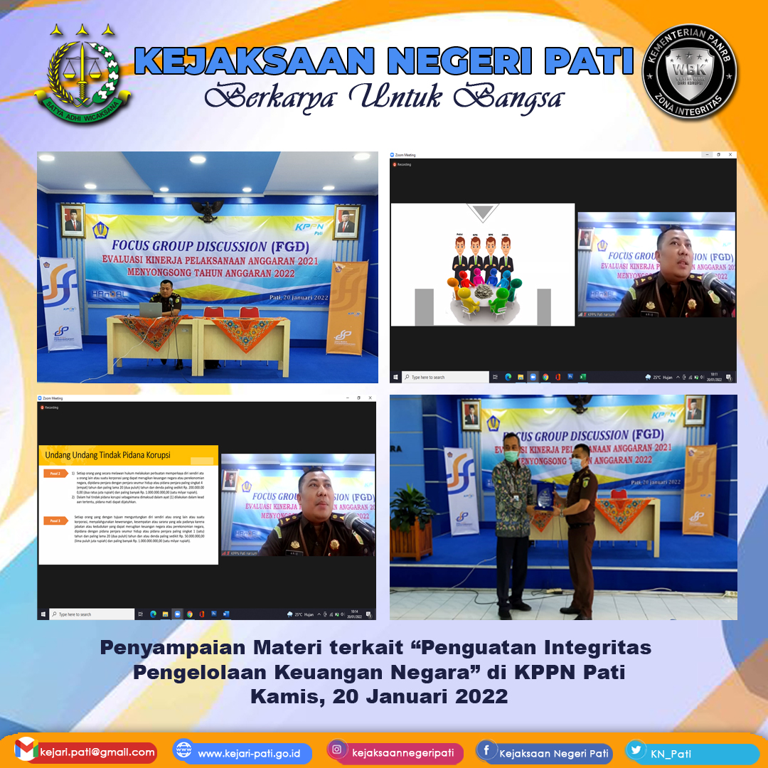 Pada hari ini Kamis, 20 Januari 2022 Bapak Arie Purnomo, S.H., M.H. menjadi narasumber dengan materi terkait "Penguatan Integritas Pengelolaan Keuangan Negara di KPPN Pati.