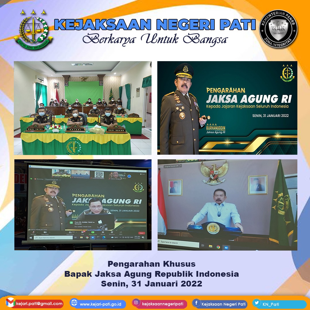 Pada hari Senin, 31 Januari 2022 Kepala Kejaksaan Negeri Pati (Bapak Mahmudi, S.H., M.H.) bersama Para Pejabat Eselon IV mengikuti Pengarahan Khusus Bapak Jaksa Agung Republik Indonesia.