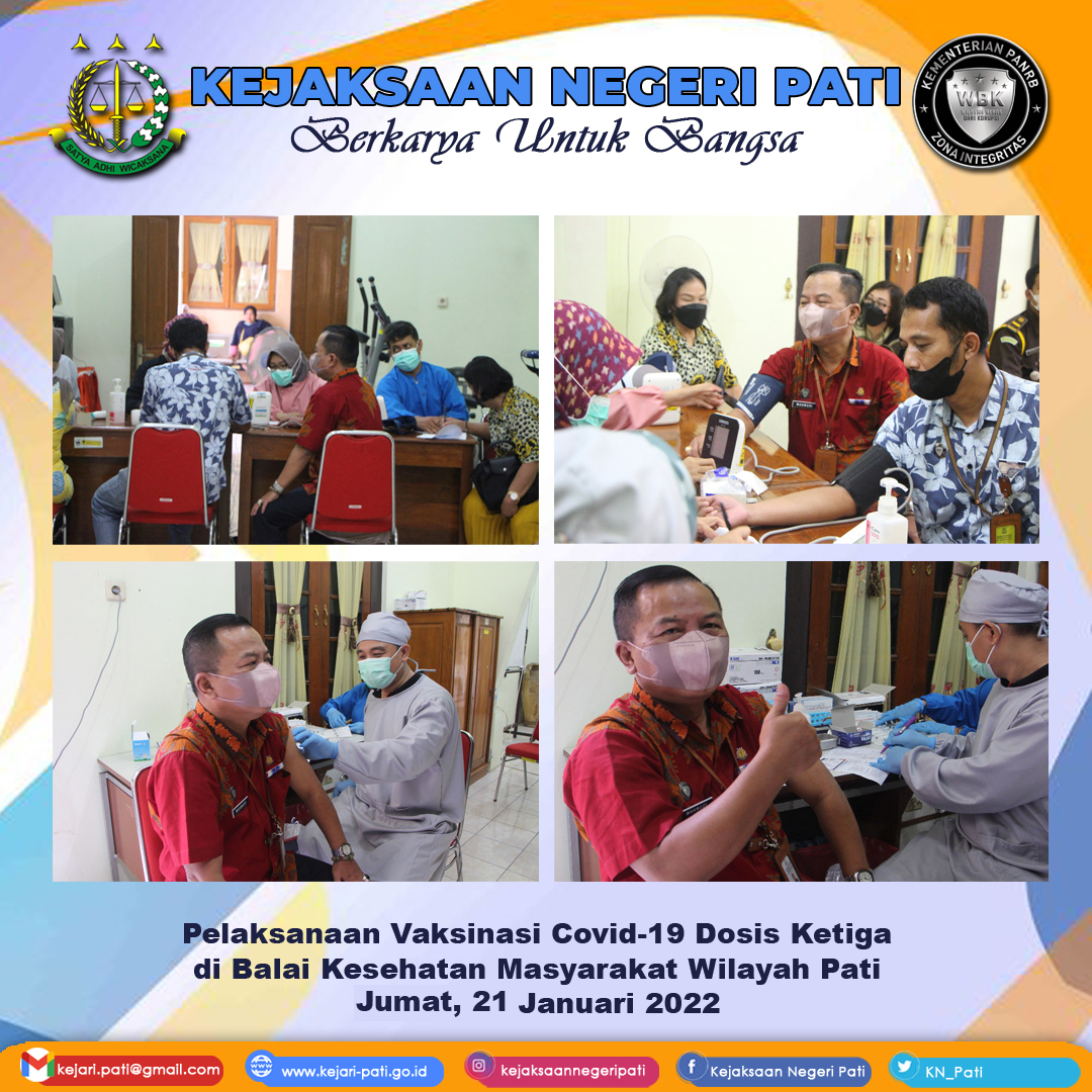 Pada hari Jumat, 24 Januari 2022 telah dilaksanakan vaksinasi dosis ketiga di Balai Kesehatan Masyarakat (BALKESMAS) Wilayah Pati.